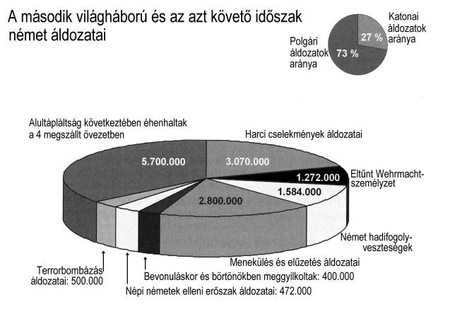 A háború alatt és az azt követő időszakban messze több német civil vesztette életét, mint katona harci bevetés közben. A háború német áldozatainak száma összesen 15,8 millió. Ebből a harci cselekmények közepette elesett katonák és eltűntek száma 4,3 millió (27%), a menekülés közben, bombazáporban, fogságban elpusztult polgári személyek száma 11,5 millió (73%).